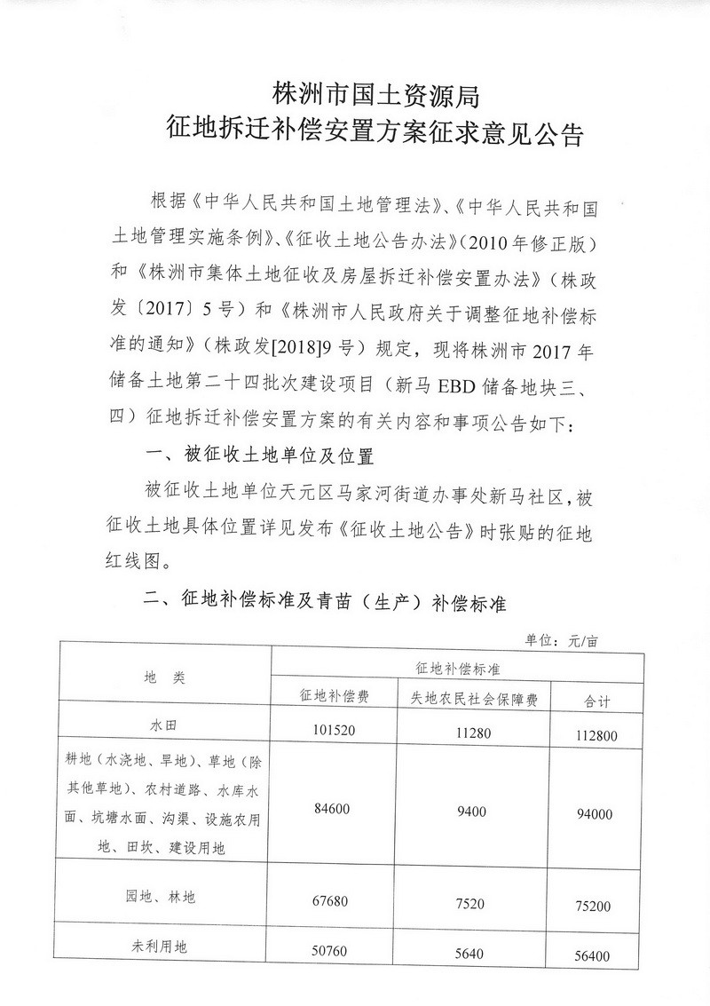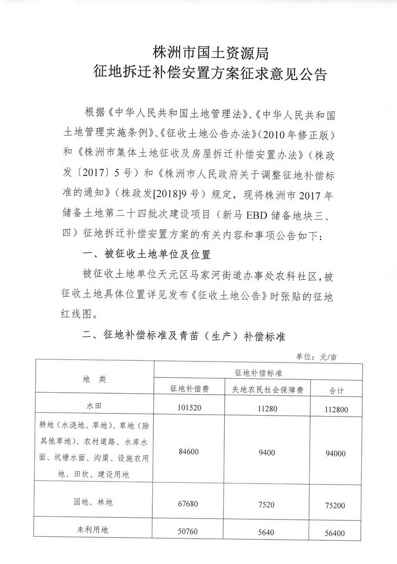 征地拆迁补偿安置方案征求意见公告--新马EBD储备地块三、四