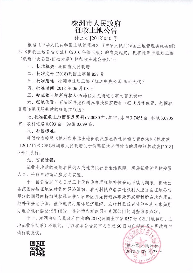 征收土地公告--株洲市规划三路(轨道中央公园--田心大道)