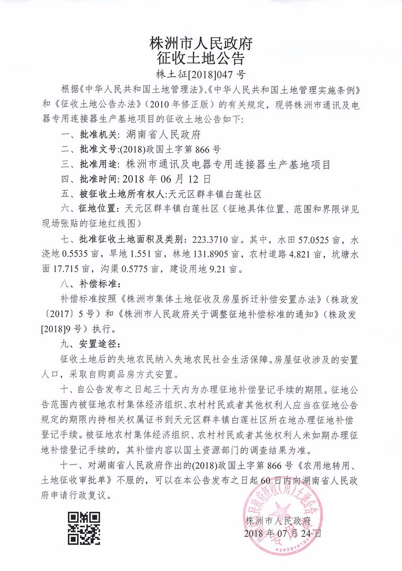 征收土地公告--株洲市通讯及电器专用连接器生产基地项目