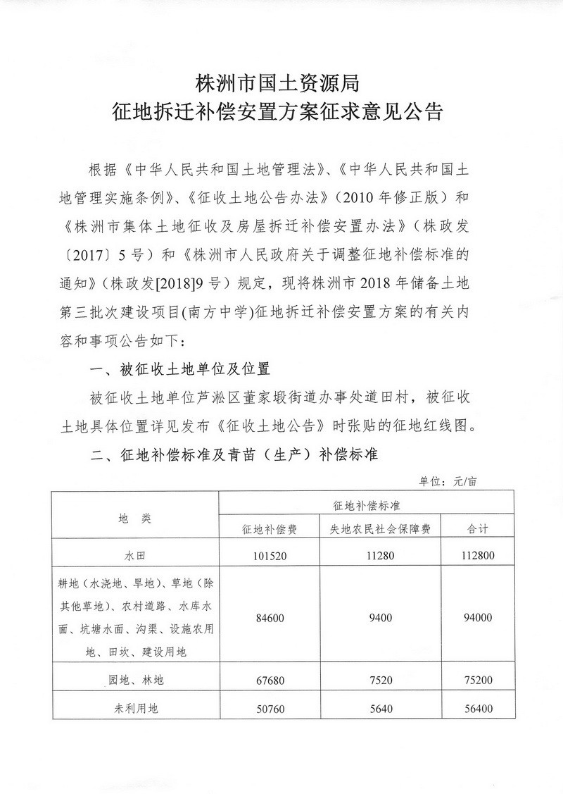 征地拆迁补偿安置方案征求意见公告—南方中学