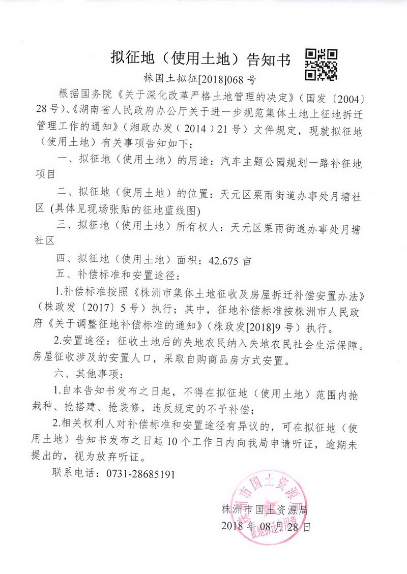 拟征地(使用土地)告知书—汽车主题公园规划一路补征地项目