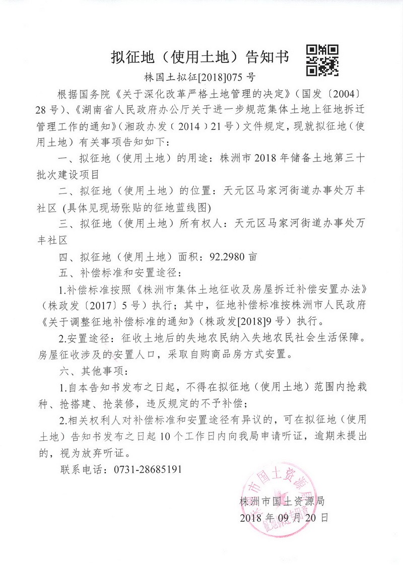 拟征地告知书--株洲市2018年储备土地第三十批次建设项目