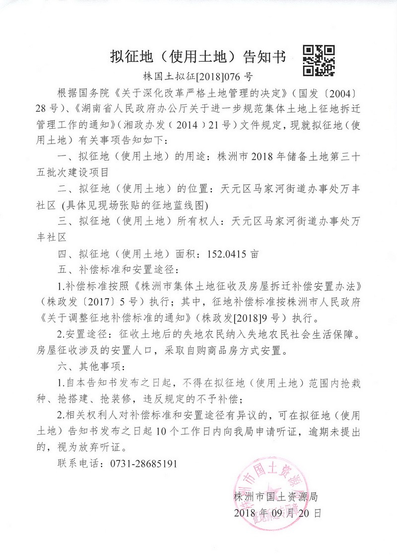 拟征地告知书--株洲市2018年储备土地第三十五批次建设项目