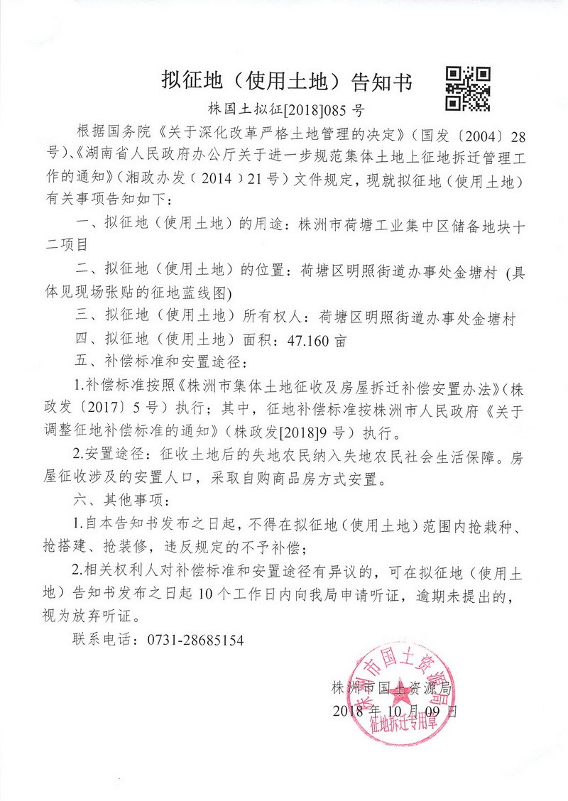 拟征地告知书--株洲市荷塘工业集中区储备地块十二项目