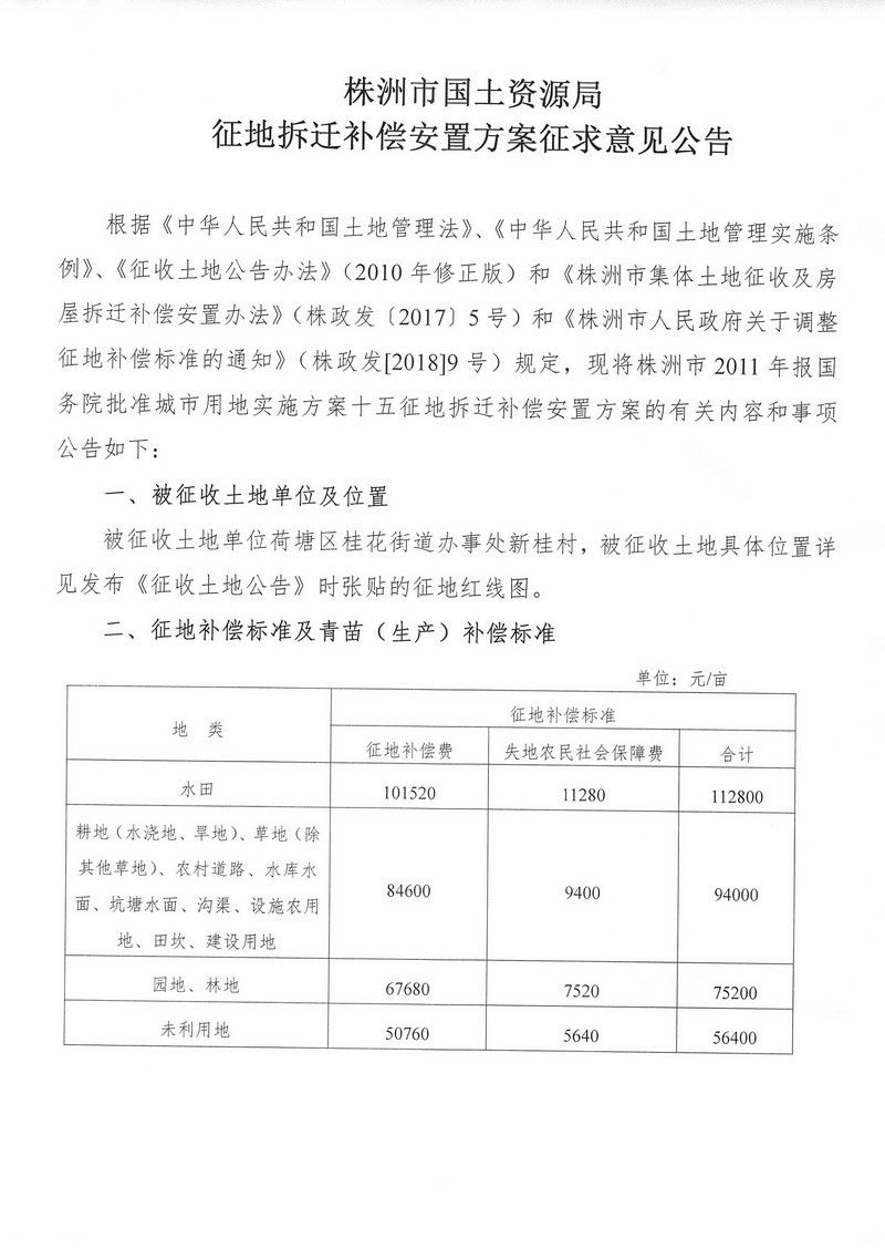 征地拆迁补偿安置方案征求意见公告-株洲市2011年报国务院批准城市用地实施方案十项目