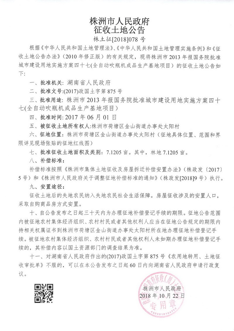 征收土地公告--全自动吹瓶机成品生产基地项目