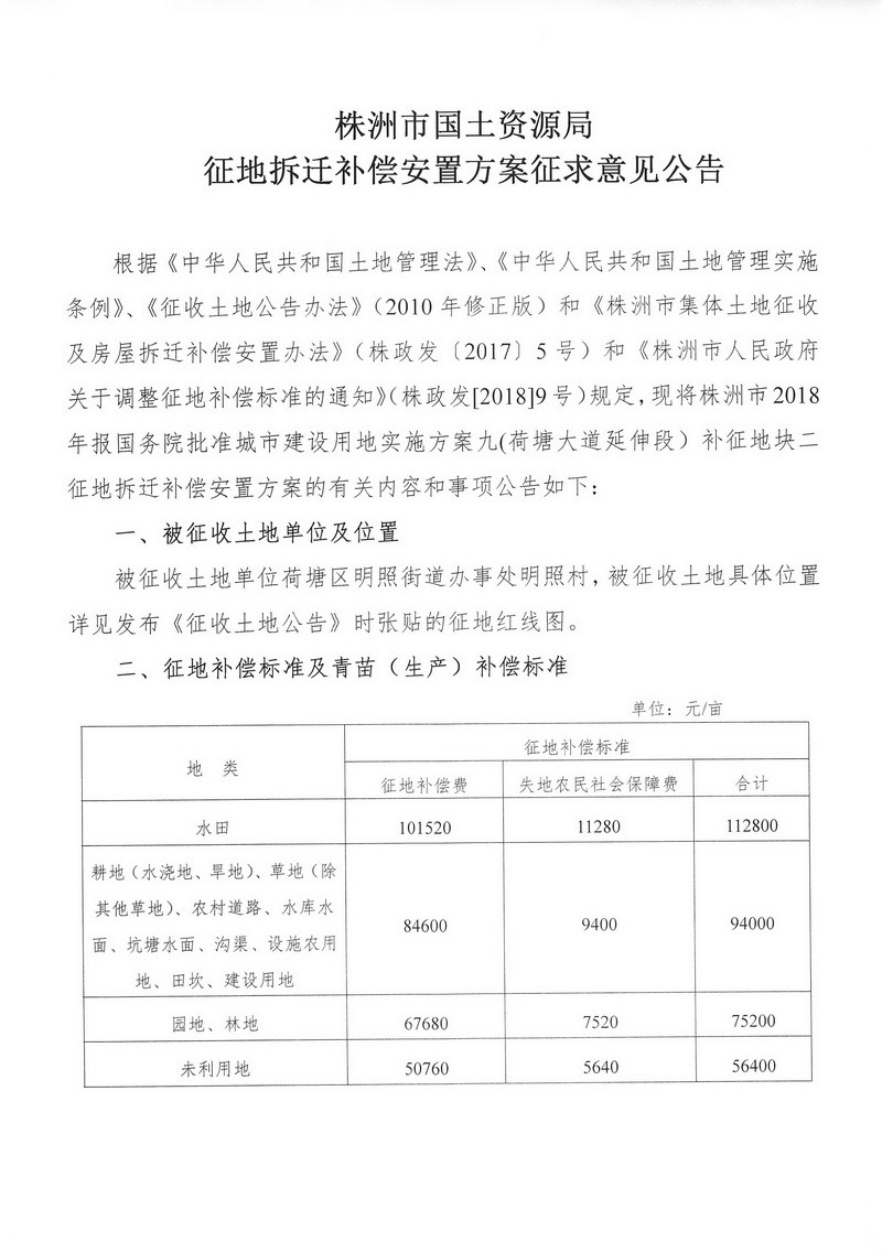 征地拆迁补偿安置方案征求意见公告--荷塘大道延伸段补征地块二