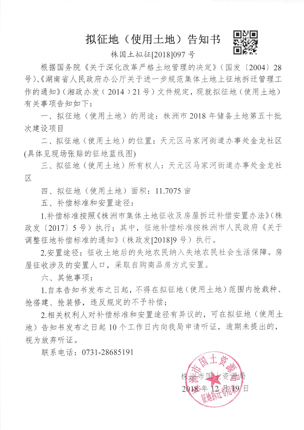 拟征地告知书--株洲市2018年储备土地第五十批次建设项目
