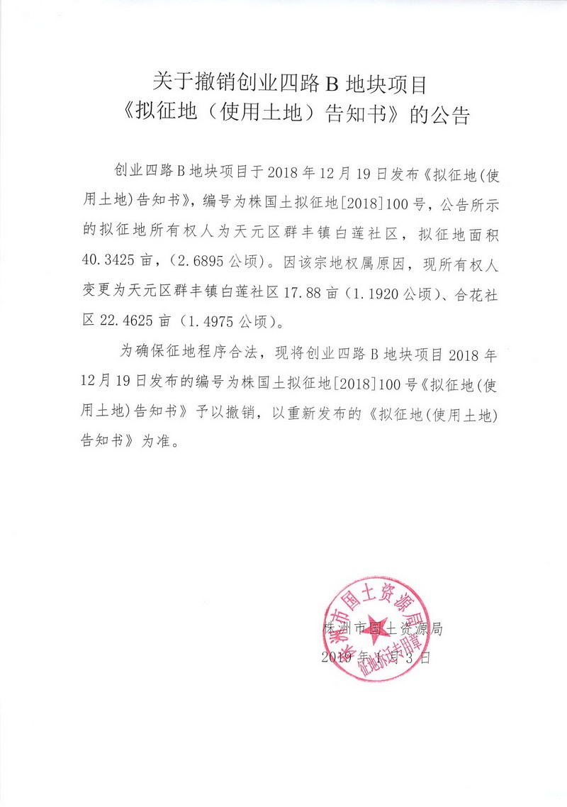 关于撤销创业四路B地块项目《拟征地(使用土地)告知书》的公告