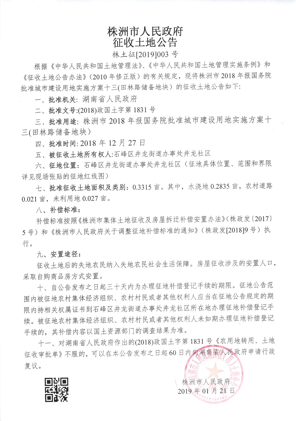 征收土地公告--田林路储备地块