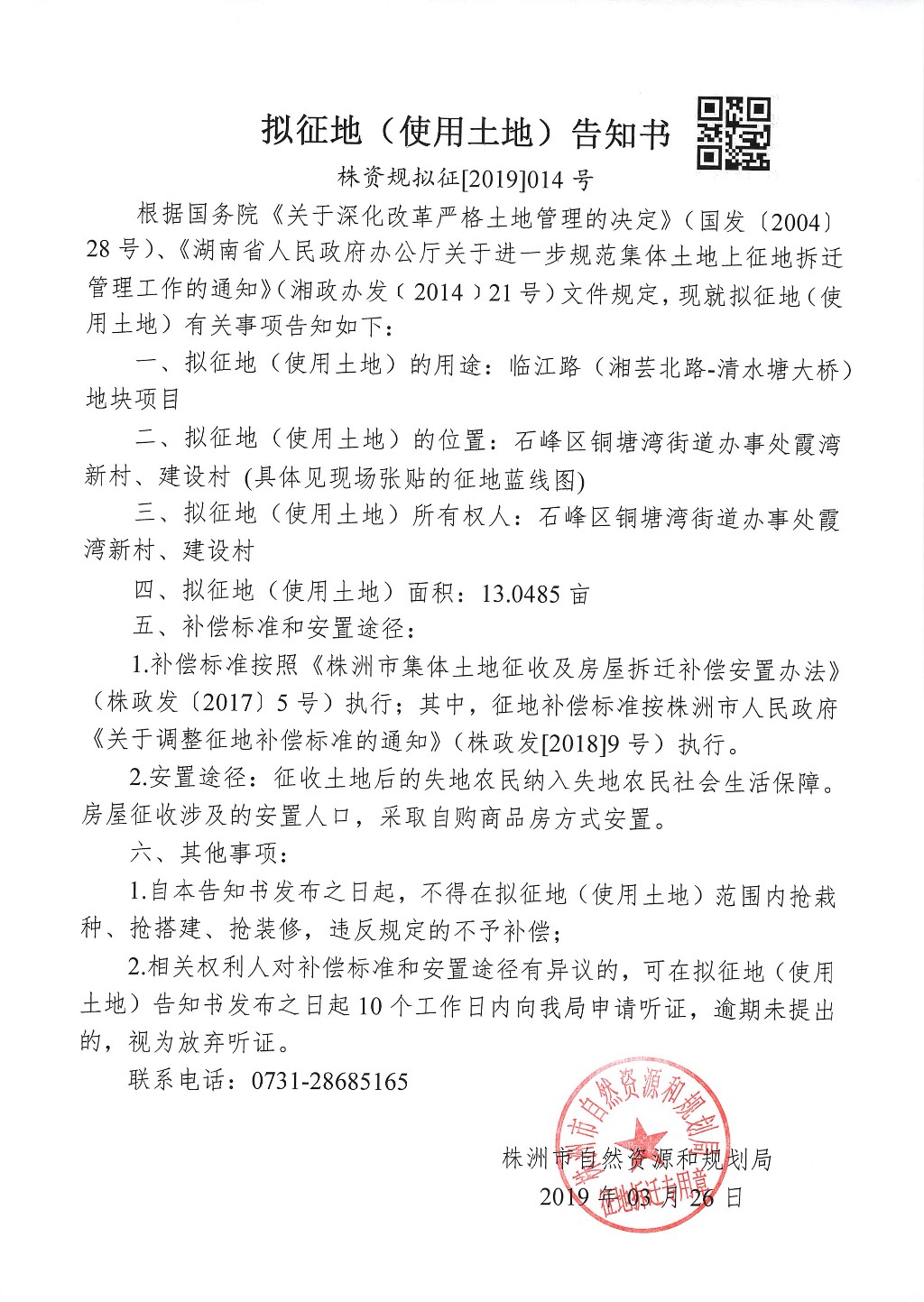 拟征地告知书--临江路(湘芸北路--清水塘大桥)地块项目