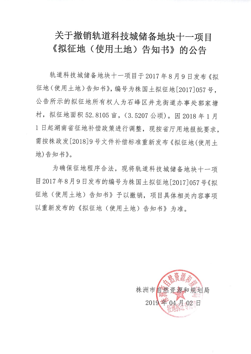 关于撤销轨道科技城储备地块十一项目《拟征地(使用土地)告知书》的公告