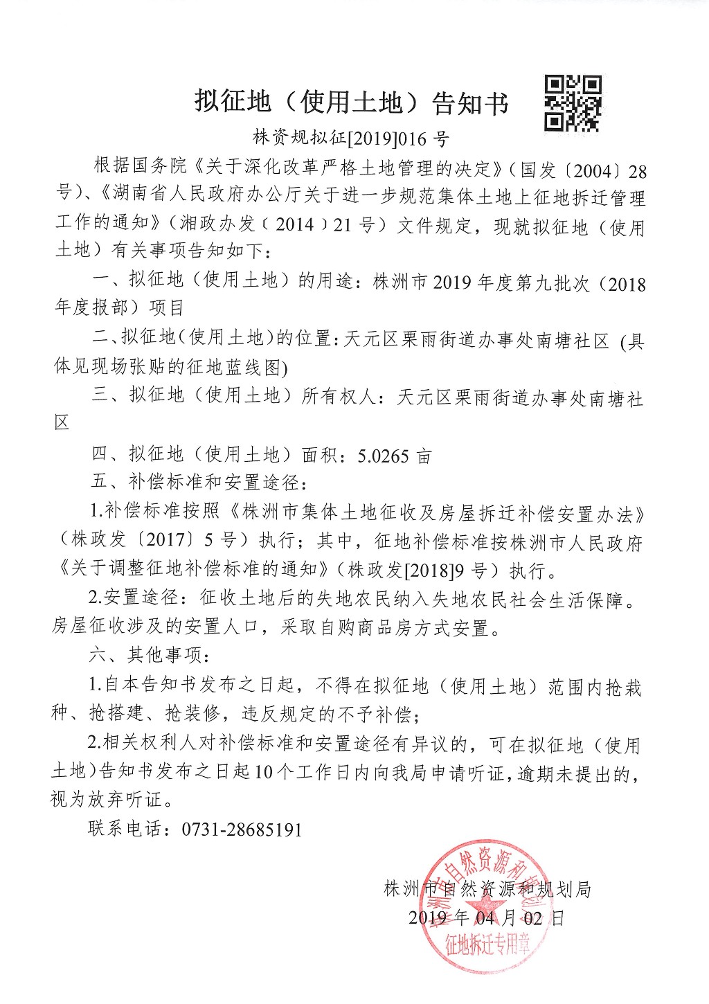 拟征地(使用土地)告知书--株洲市2019年第九批次(2018年度报部)项目