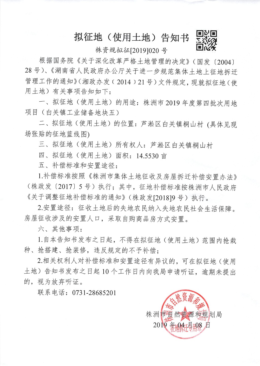 拟征地(使用土地)告知书--株洲市2019年度第四批次用地项目(白关镇工业储备地块五)