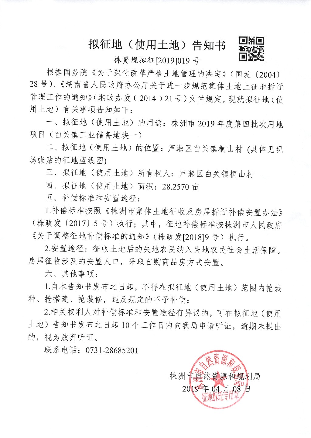 拟征地(使用土地)告知书--株洲市2019年度第四批次用地项目(白关镇工业储备地块一)