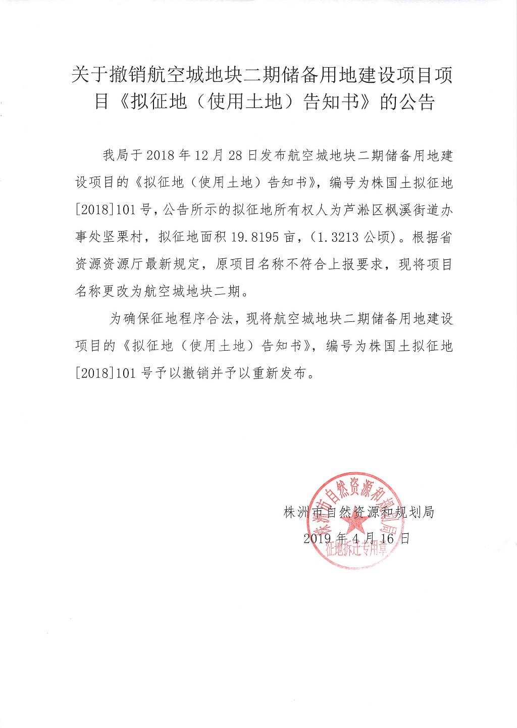 关于撤销航空城地块二期储备用地建设项目《拟征地(使用土地)告知书》的公告