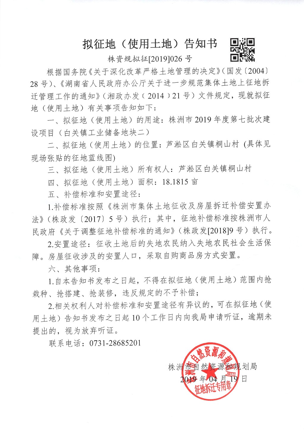 拟征地(使用土地)告知书--株洲市2019年度第七批次建设项目(白关镇工业储备地块二)