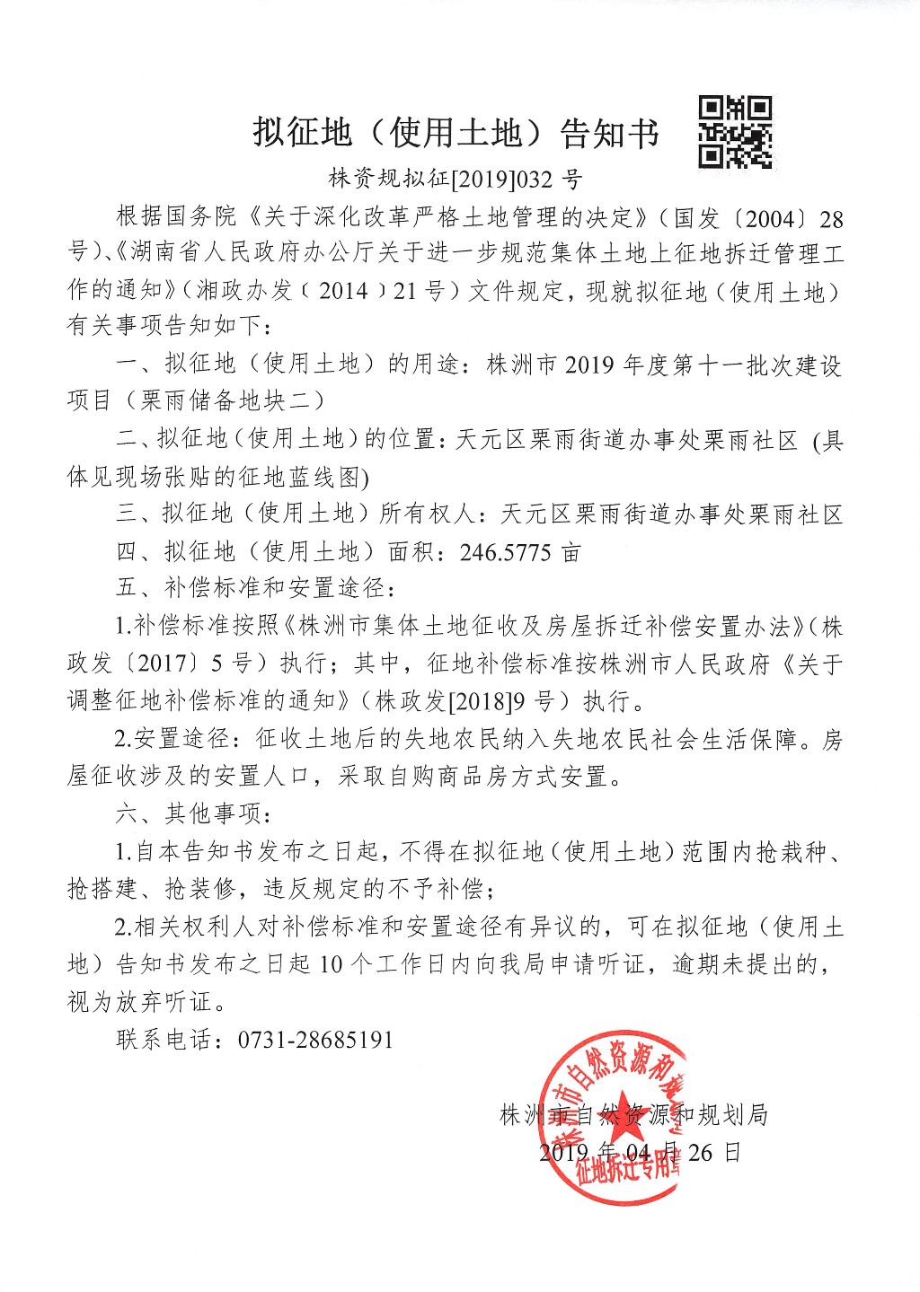 拟征地(使用土地)告知书--株洲市2019年度第十一批次建设项目(栗雨储备地块二)