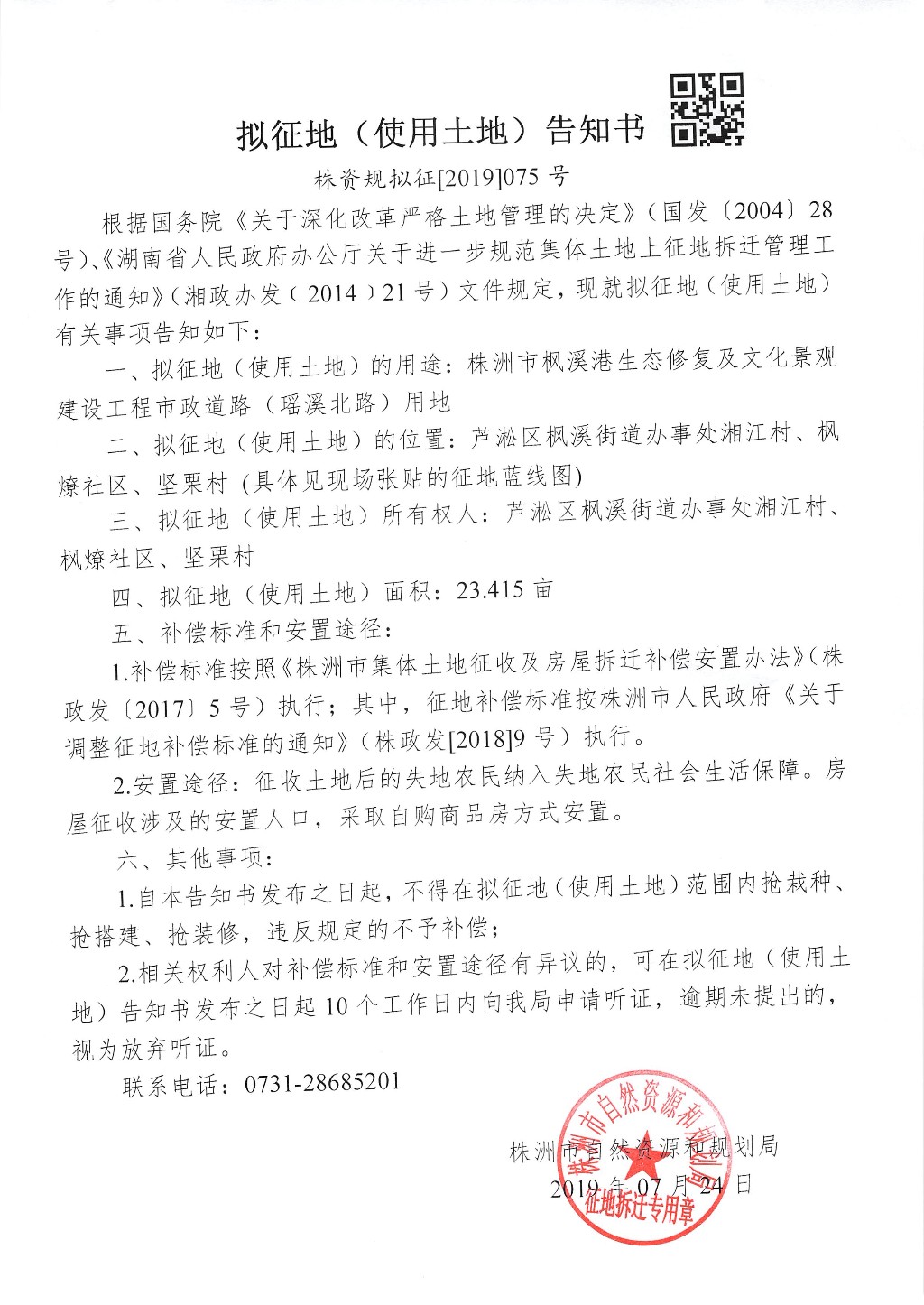 拟征地(使用土地)告知书--株洲市枫溪港生态修复及文化景观建设工程市政道路(瑶溪北路)用地