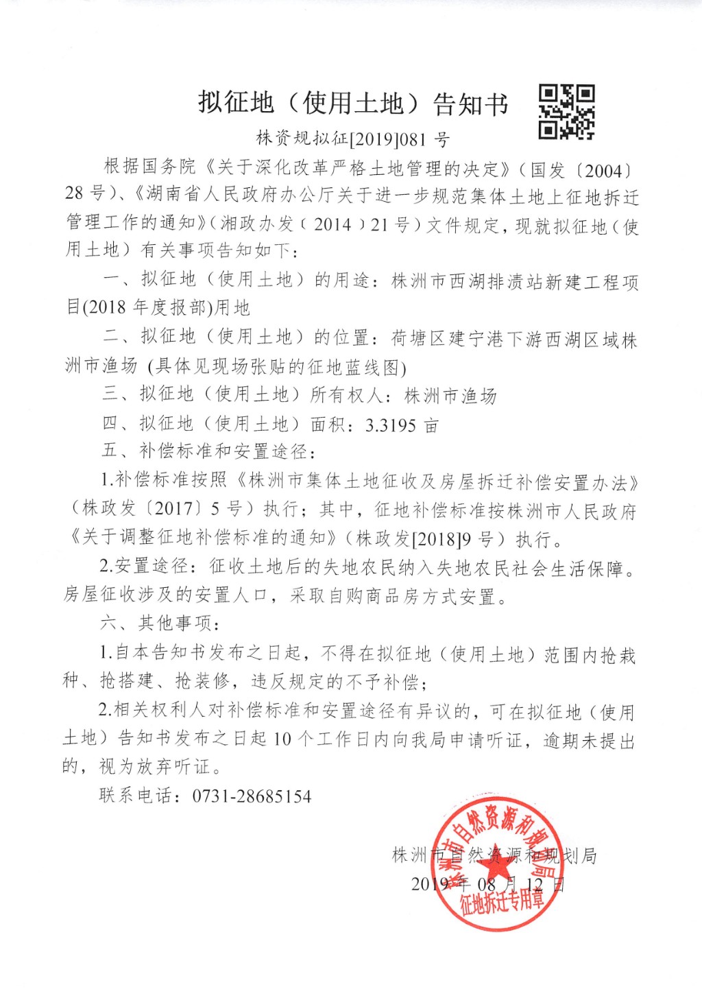 拟征地(使用土地)告知书--株洲市西湖排渍站新建工程项目用地(2018年度报部)