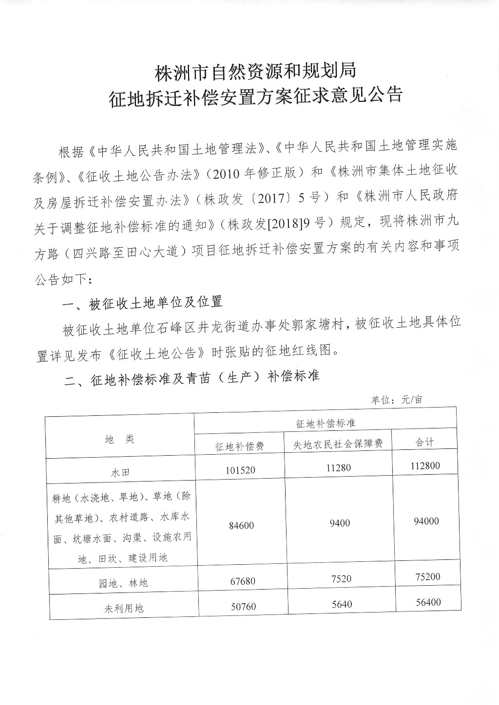 征地拆迁补偿安置方案征求意见公告--株洲市九方路(四兴路至田心大道)项目