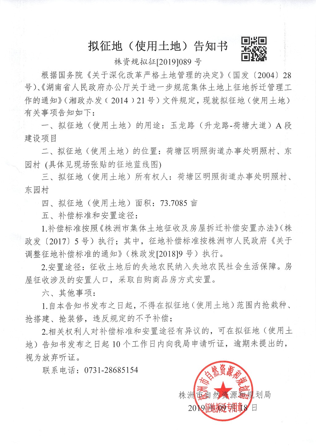 拟征地(使用土地)告知书--玉龙路(升龙路--荷塘大道)A段建设项目