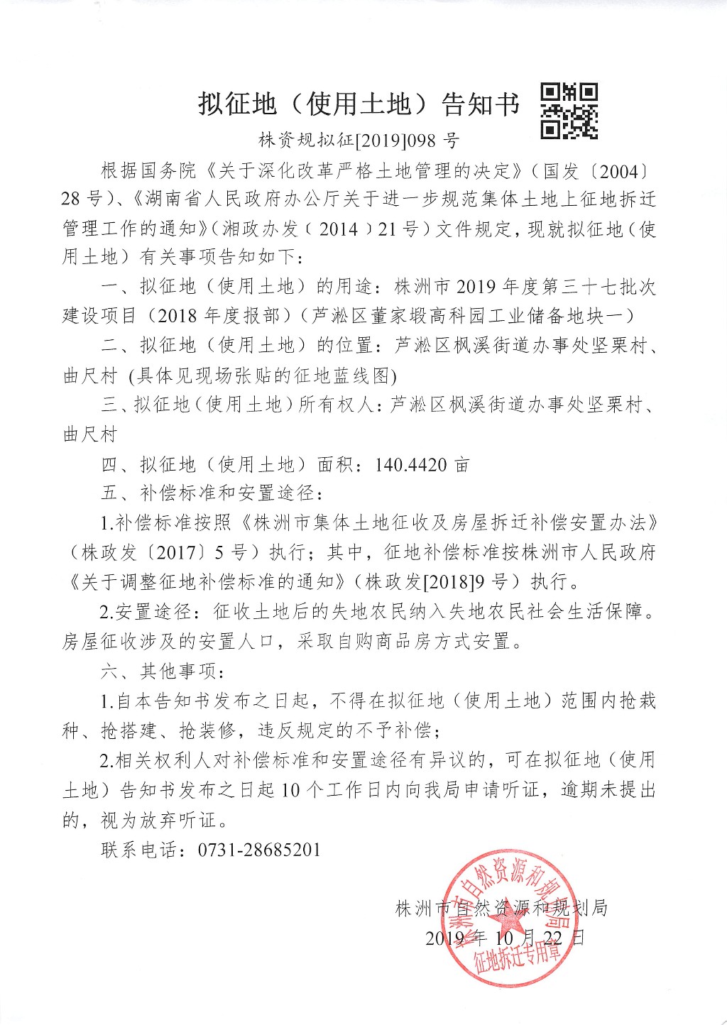 拟征地告知书--芦淞区董家塅高科园工业储备地块一