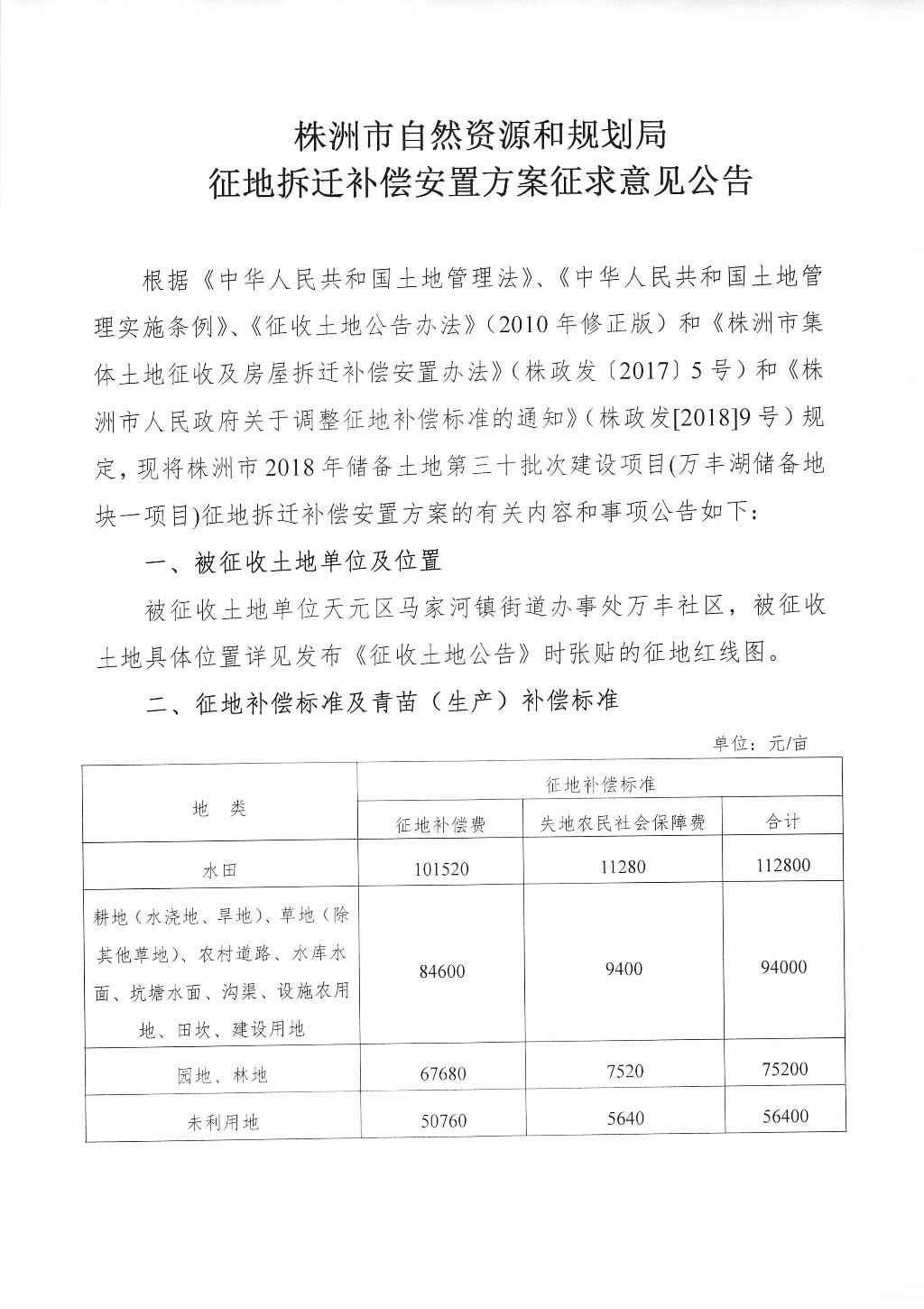 征地拆迁补偿安置方案征求意见公告--万丰湖储备地块一项目