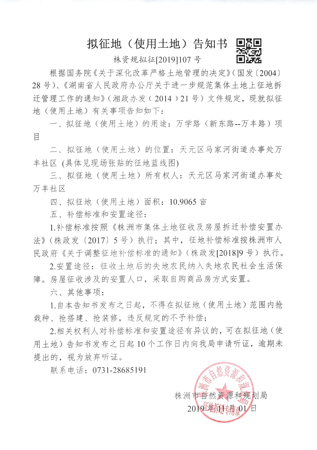 拟征地(使用土地)告知书--万学路(新东路--万丰路)项目