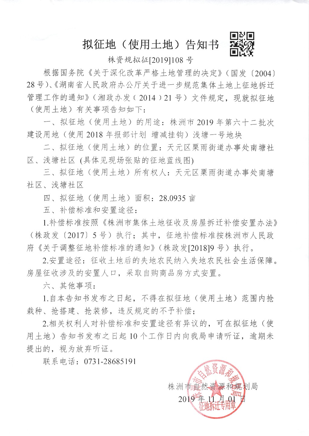拟征地(使用土地)告知书--株洲市2019年第六十二批次建设用地(使用2018年报部计划 增减挂钩)浅塘一号地块