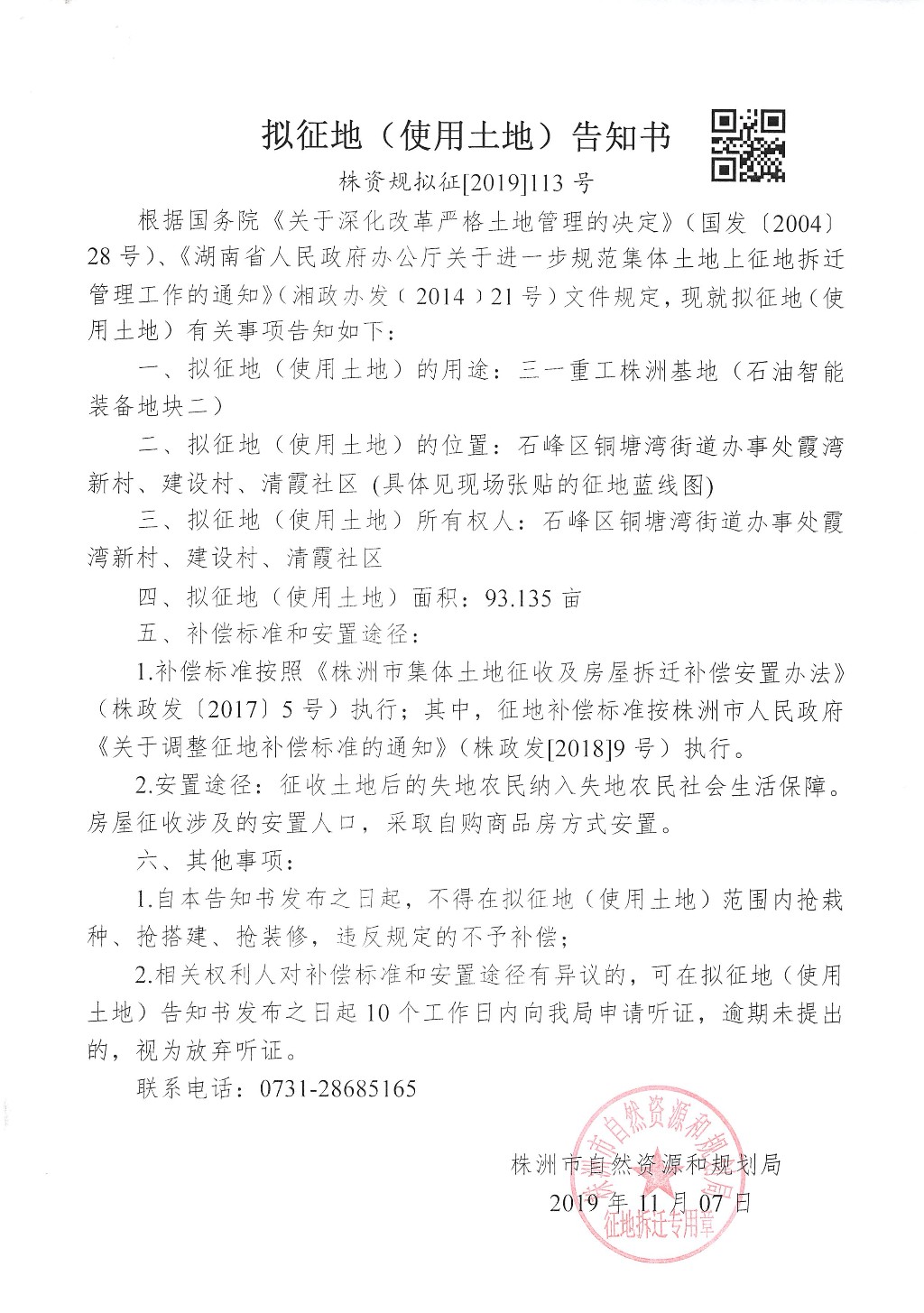 拟征地(使用土地)告知书--三一重工株洲基地(石油智能装备地块二)