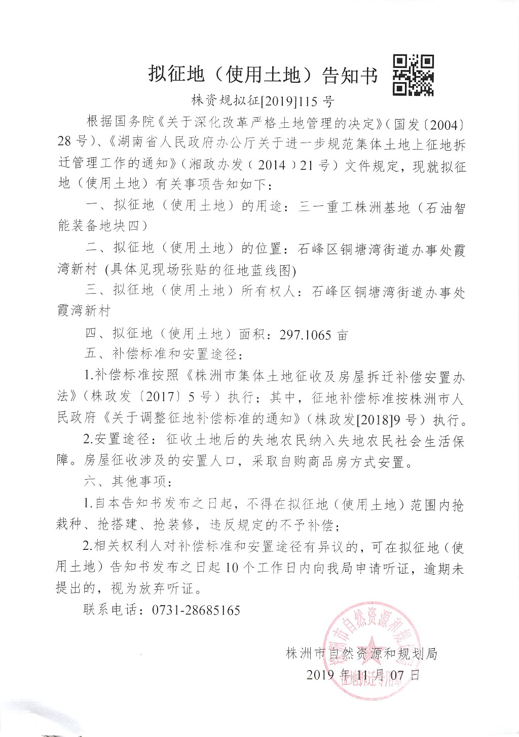 拟征地(使用土地)告知书--三一重工株洲基地(石油智能装备地块四)
