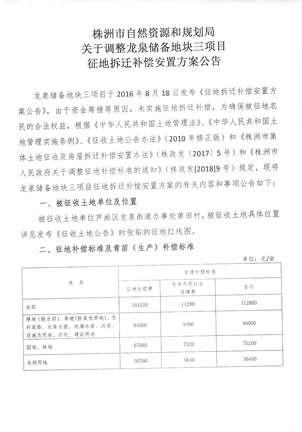 关于调整龙泉储备地块三项目征地拆迁补偿安置方案公告