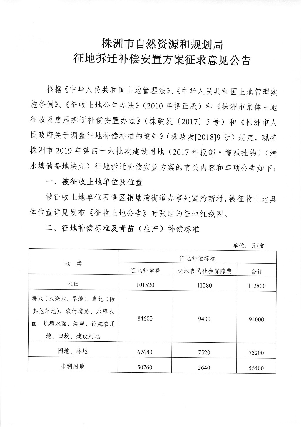 征地拆迁补偿安置方案征求意见公告--清水塘储备地块九