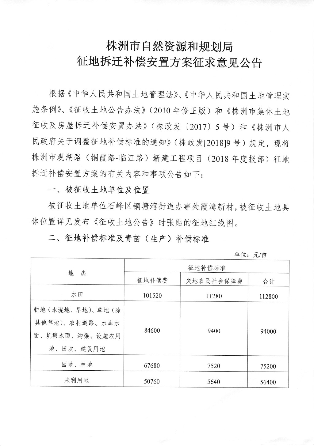 征地拆迁补偿安置方案征求意见公告--株洲市观湖路(铜霞路--临江路)新建工程项目