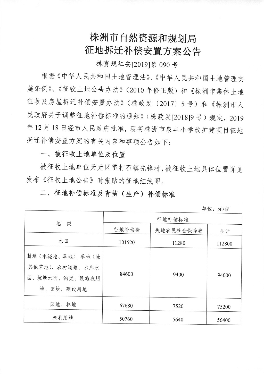 征地拆迁补偿安置方案公告--株洲市泉丰小学改扩建项目