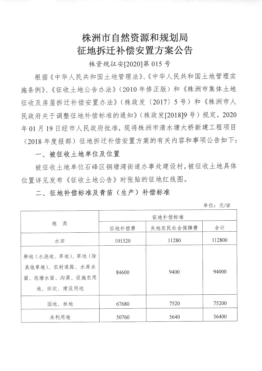 征地拆迁补偿安置方案公告--株洲市清水塘大桥新建工程项目(2018年度报部)
