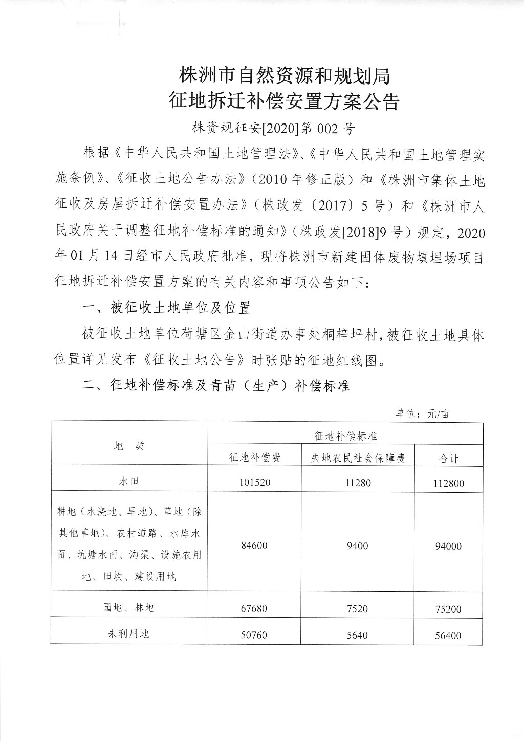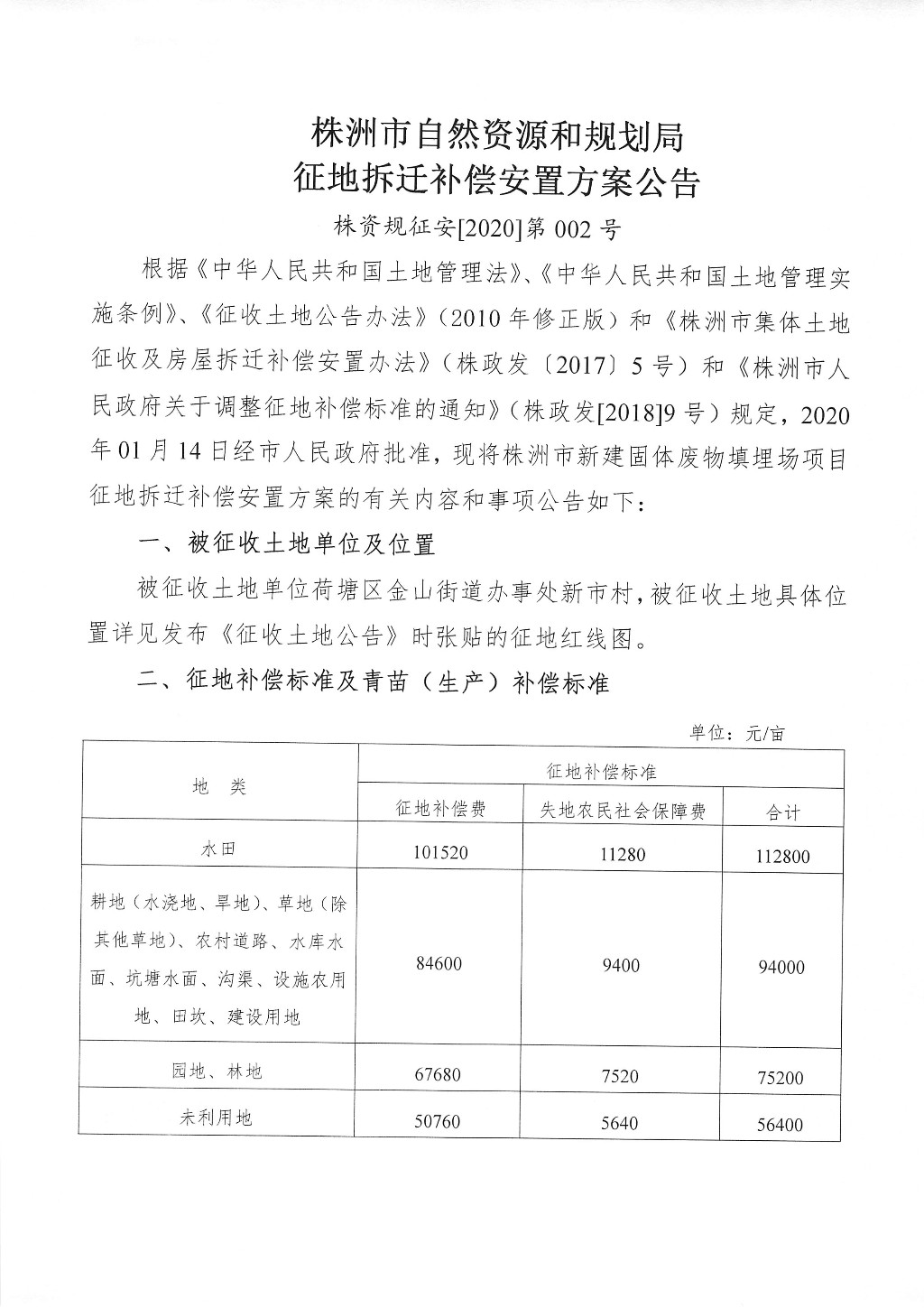 征地拆迁补偿安置方案公告--株洲市新建固体废物填埋场项目