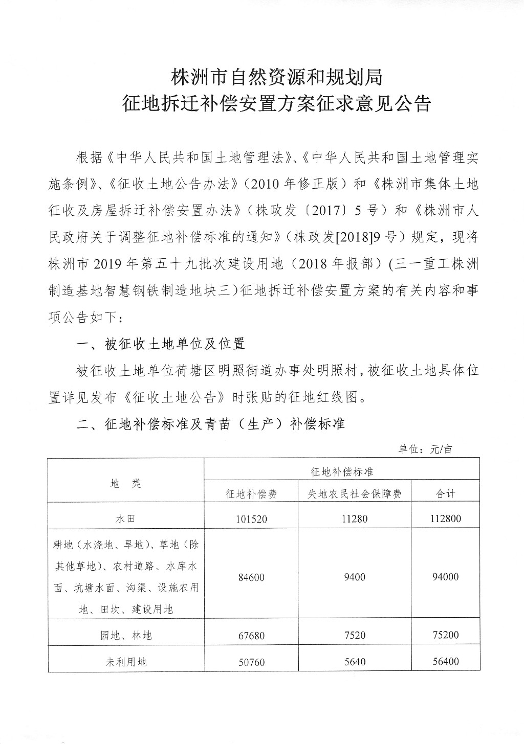 征地拆迁补偿安置方案征求意见公告---三一重工株洲制造基地智慧钢铁制造地块三