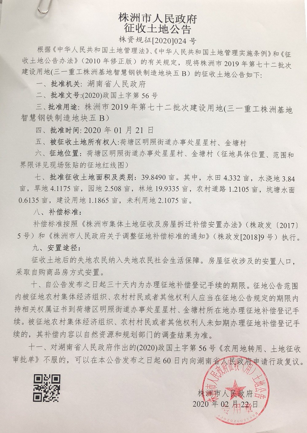 征收土地公告--三一重工株洲制造基地智慧钢铁制造地块五B