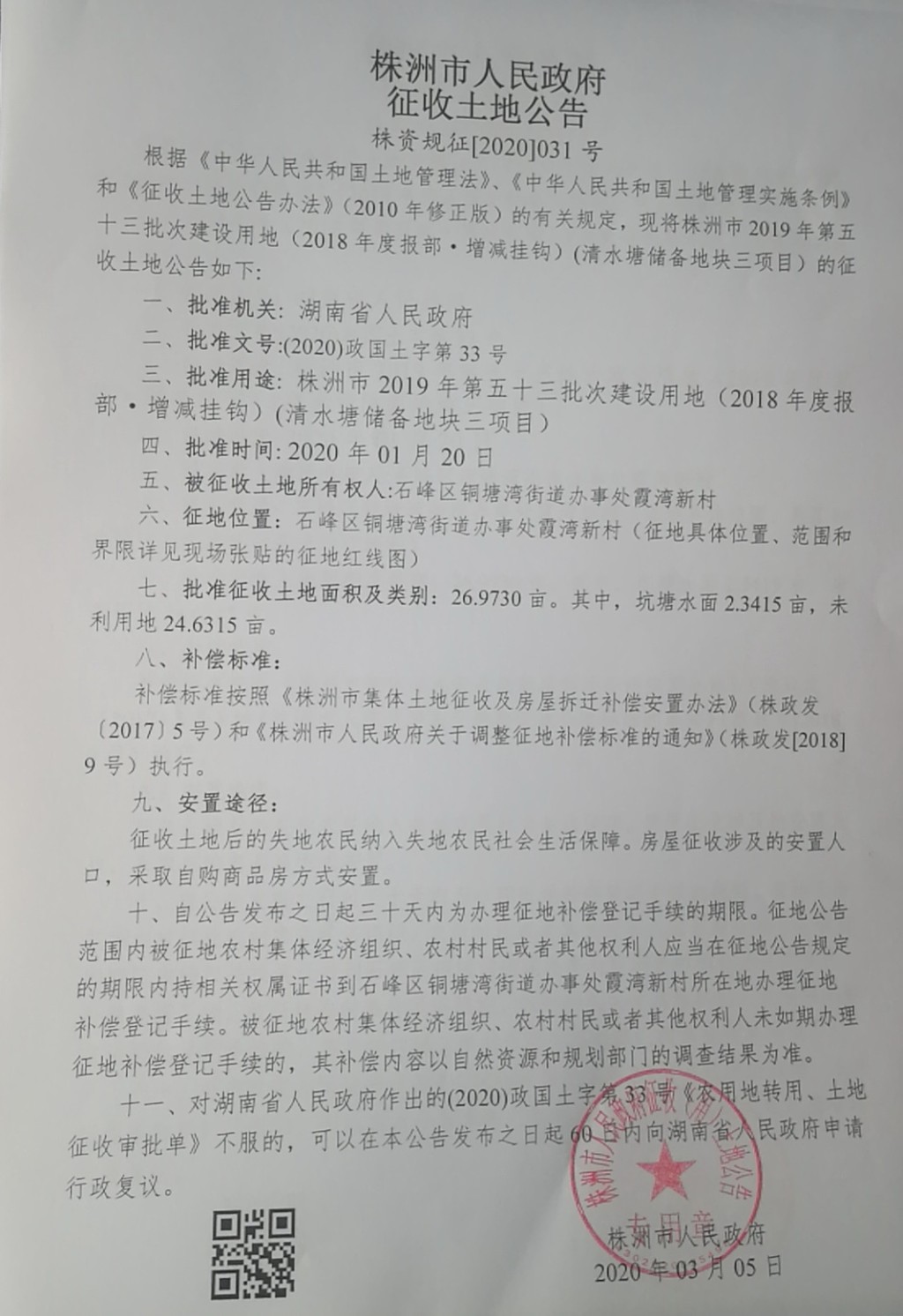 征收土地公告--清水塘储备地块三项目