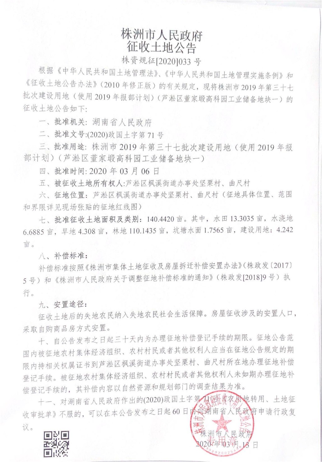 征收土地公告--芦淞区董家塅高科园工业储备地块一