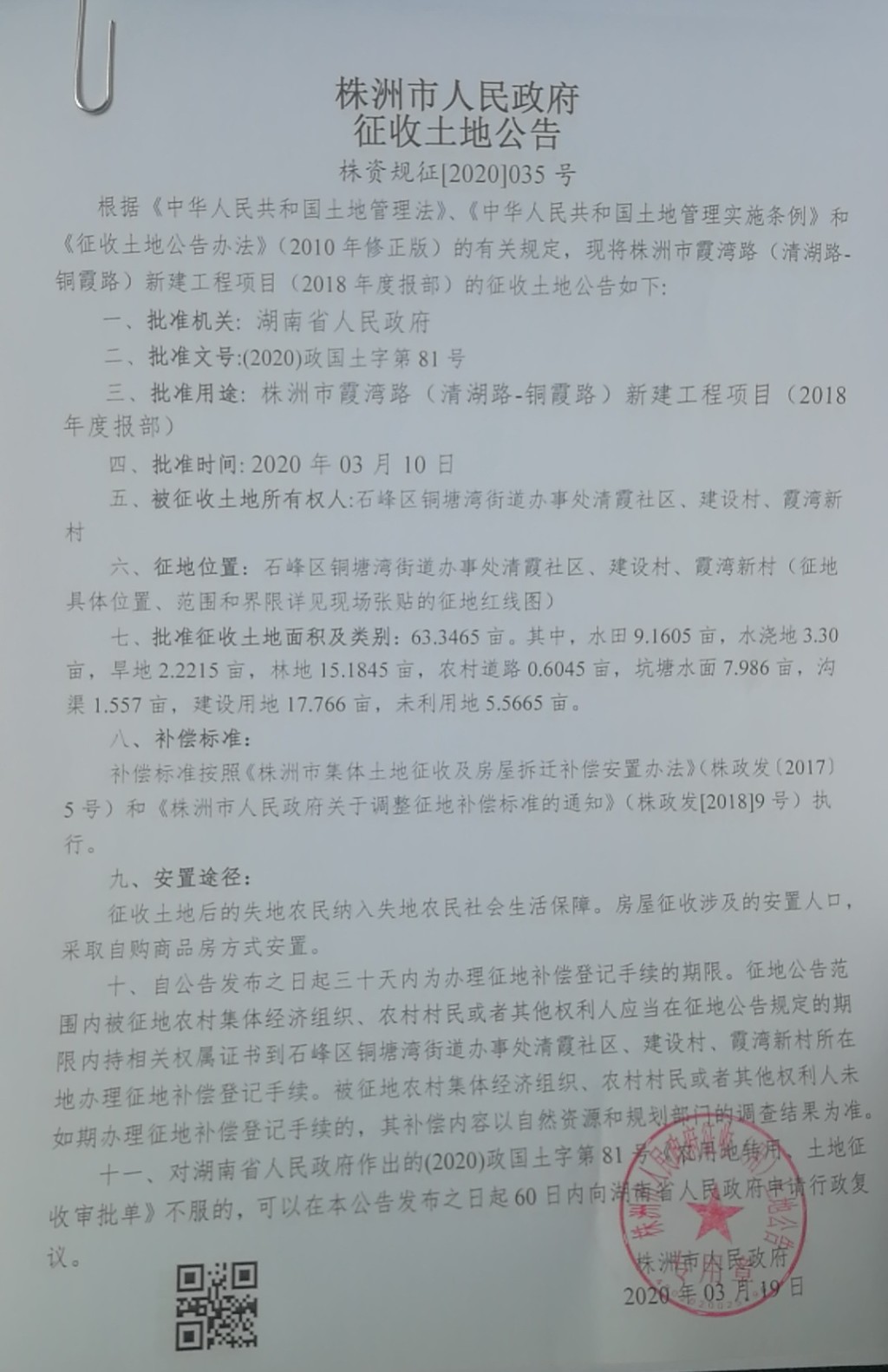 征收土地公告--霞湾路(清湖路--铜霞路)新建工程项目