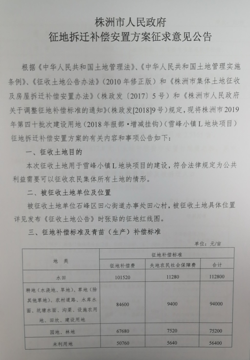 征地拆迁补偿安置方案征求意见公告--雪峰小镇L地块项目