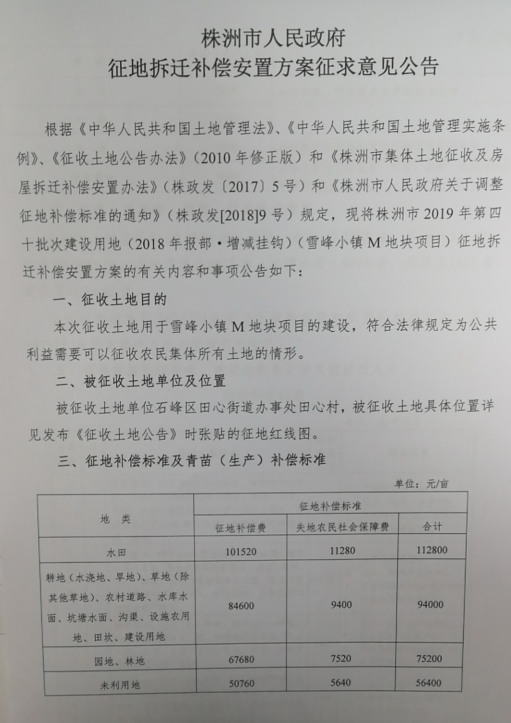 征地拆迁补偿安置方案征求意见公告--雪峰小镇M地块项目
