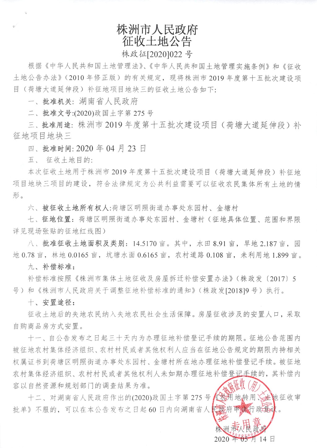 征收土地公告--荷塘大道延伸段补征地项目地块三