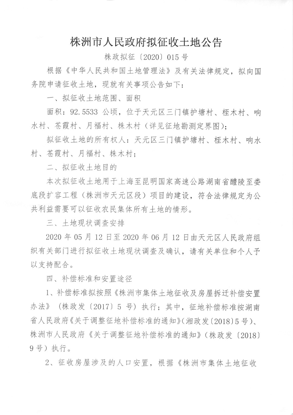 拟征收土地公告--上海至昆明国家高速公路湖南省醴陵至娄底段扩容工程(株洲市天元区段)项目