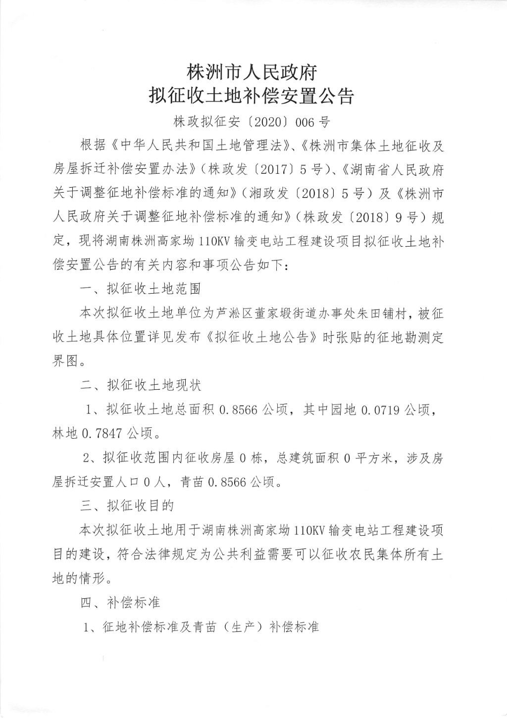 拟征收土地补偿安置公告--湖南高家坳110KV输变电站工程建设项目