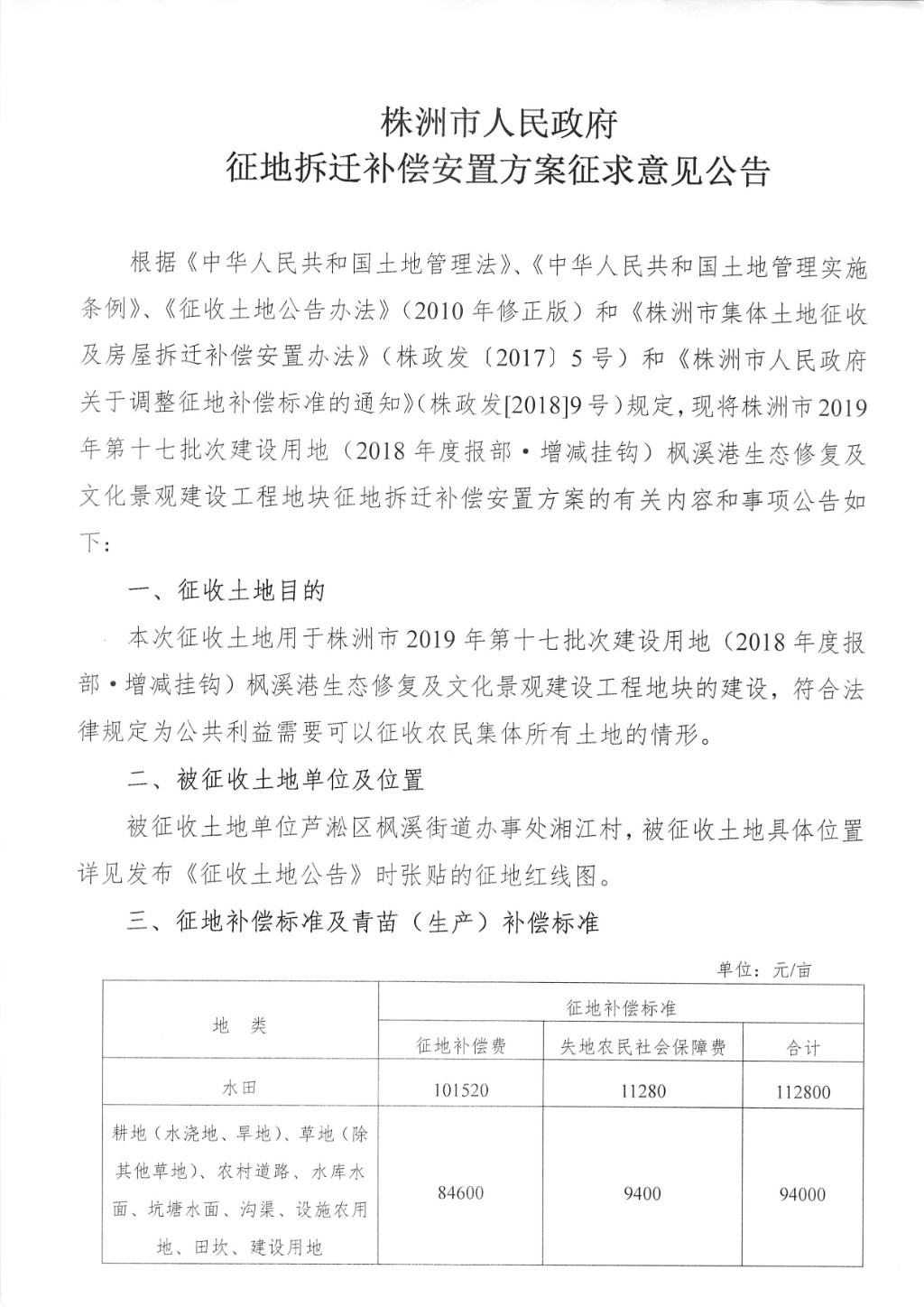 征地拆迁补偿安置方案征求意见公告--枫溪港生态修复及文化景观建设工程地块-