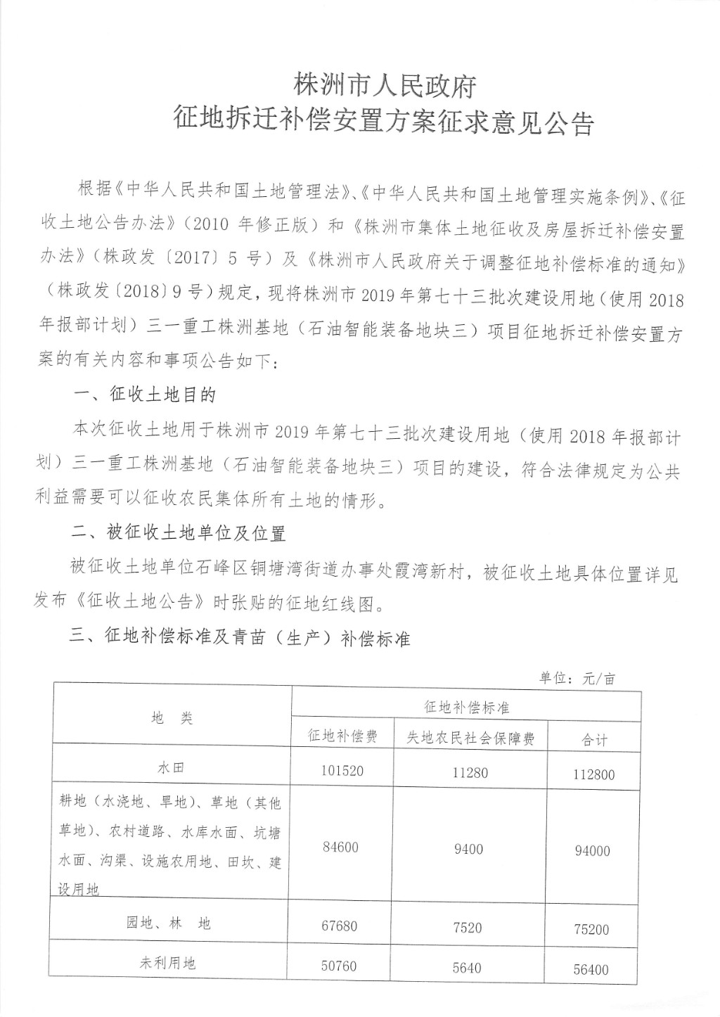 征地拆迁补偿安置方案征求意见公告--三一重工株洲基地(石油智能装备地块三)